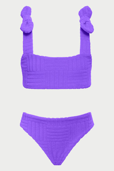 The Little Stella Two Piece features darling bows on fixed straps in our best-selling towel terry jacquard fabric, this is lightweight, breathable, soft to the touch. In our new vivid ultra violet shade. Match your mini in the Blair Top & Highway Bottom or Celine One Piece in Ultra Violet.