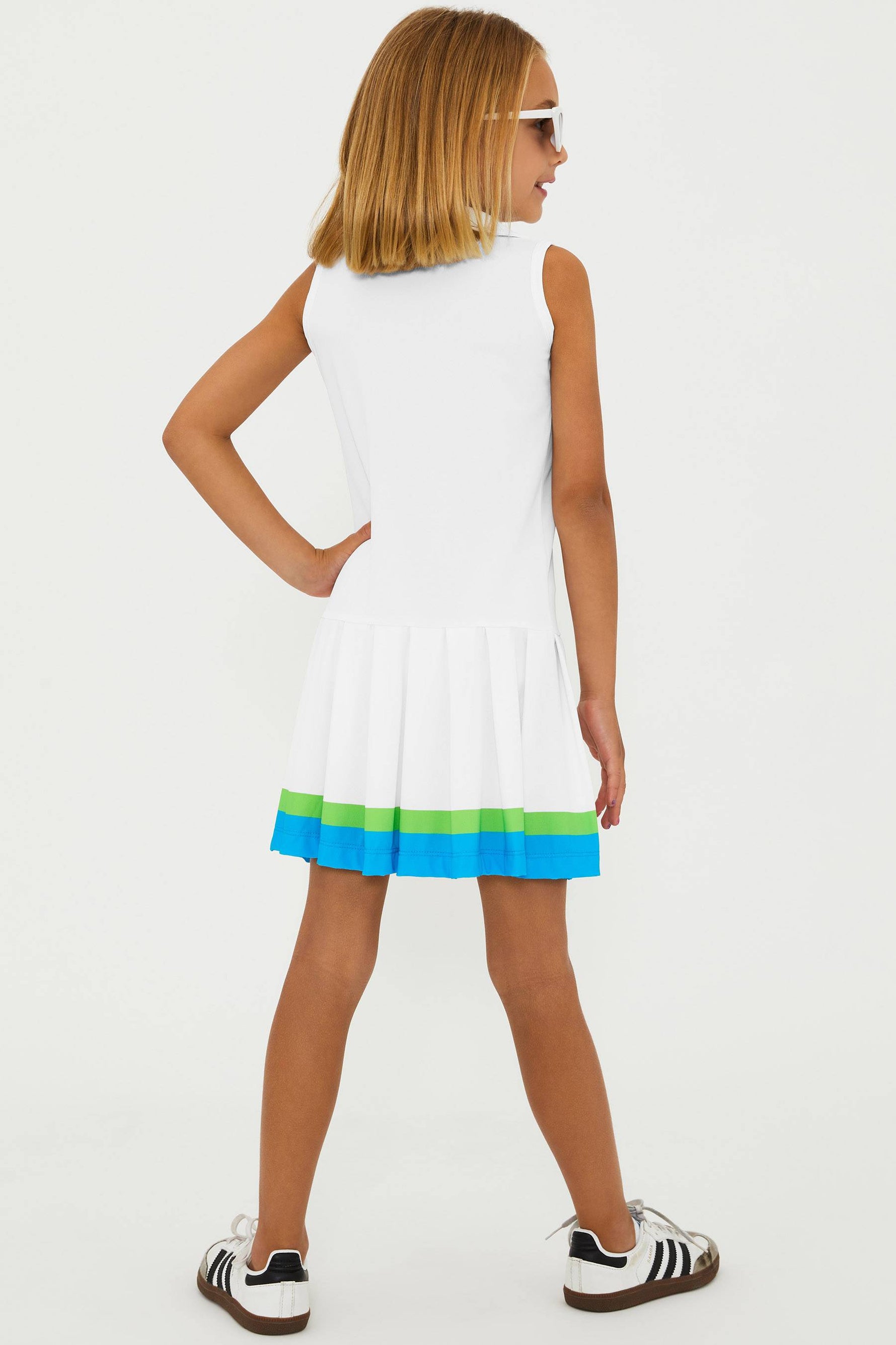 The Little Yari Dress brings tennis court style to kids' everyday routine. This sleeveless polo dress features a pleated skirt and contrast stripes of blue and green giving it a retro-inspired vibe.